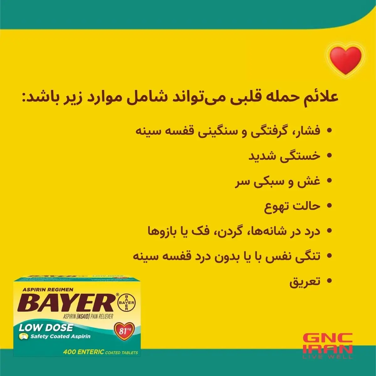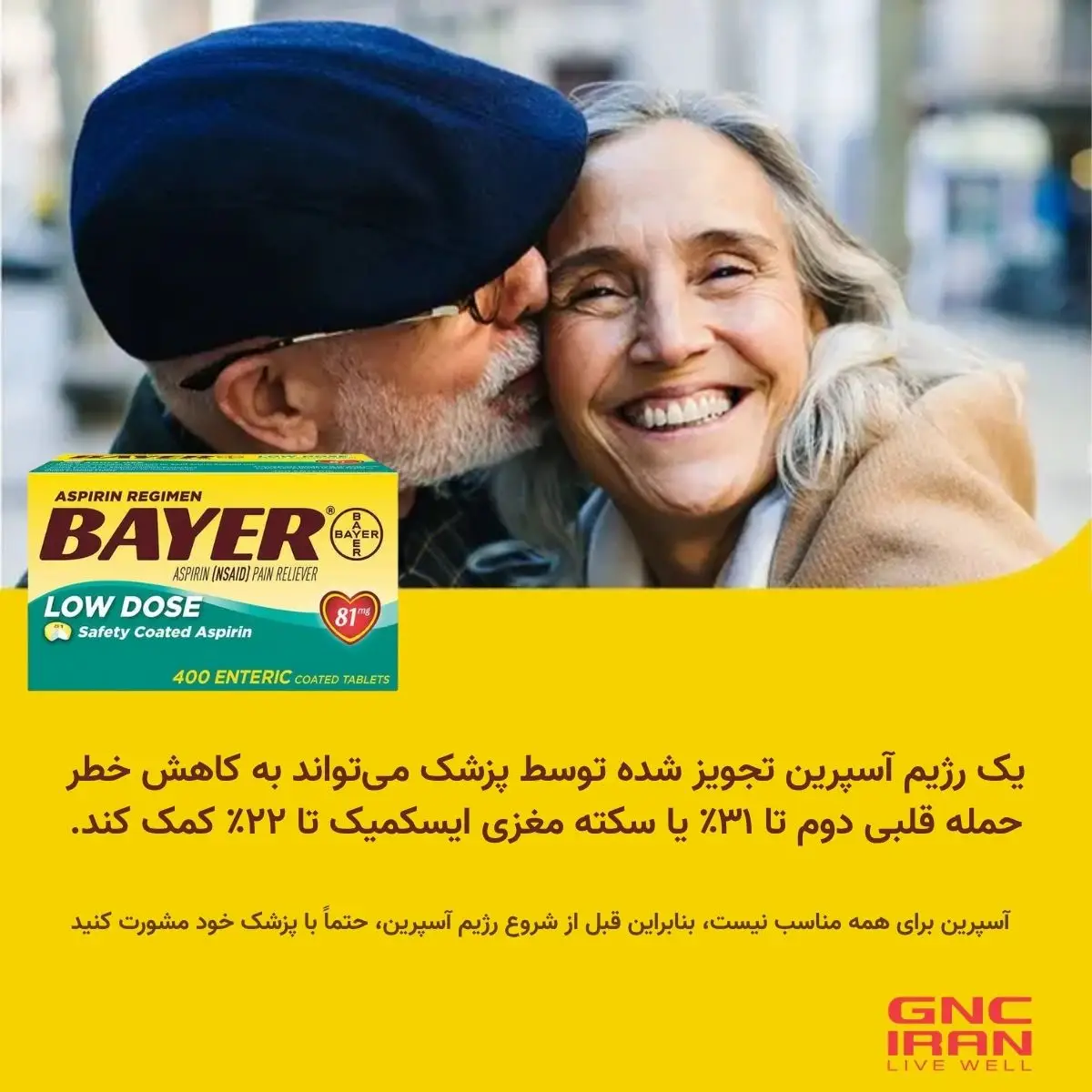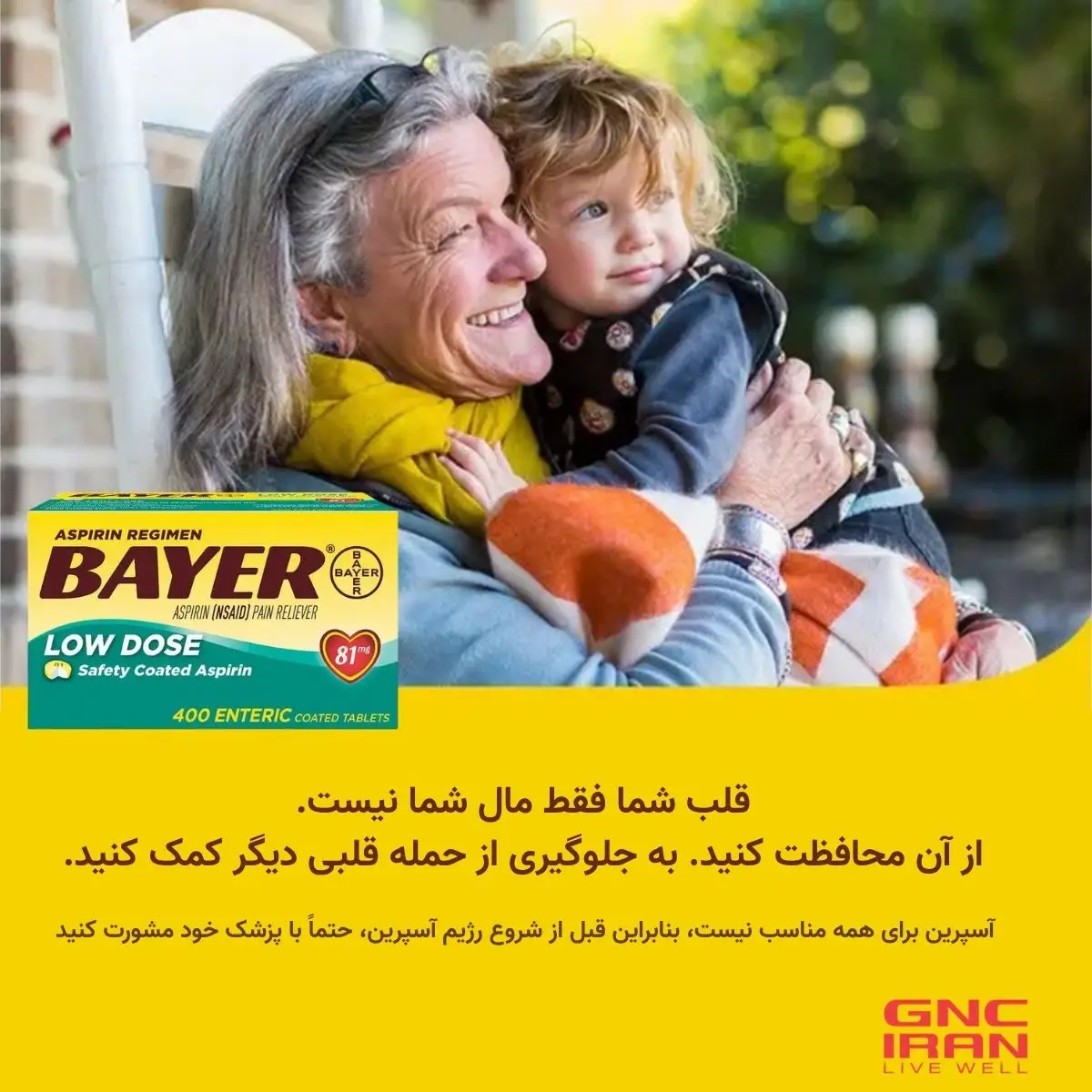 آسپرین بایر دوز پایین ۸۱ میلیگرمی یک قرص تخصصی برای محافظت از قلب و عروق است که با جلوگیری از تجمع پلاکتها بهطور مؤثری خطر حمله قلبی دوم و سکته مغزی را کاهش میدهد. روکش رودهای آن باعث میشود تحریک معده بهحداقل برسد. این محصول برای بزرگسالانی که پزشک برایشان آسپرین کمدوز تجویز کرده، افرادی با سابقه مشکلات قلبی، افرادی که نیاز به پیشگیری از لخته دارند و کسانی که گاهی دردهای خفیف را تجربه میکنند مناسب است.