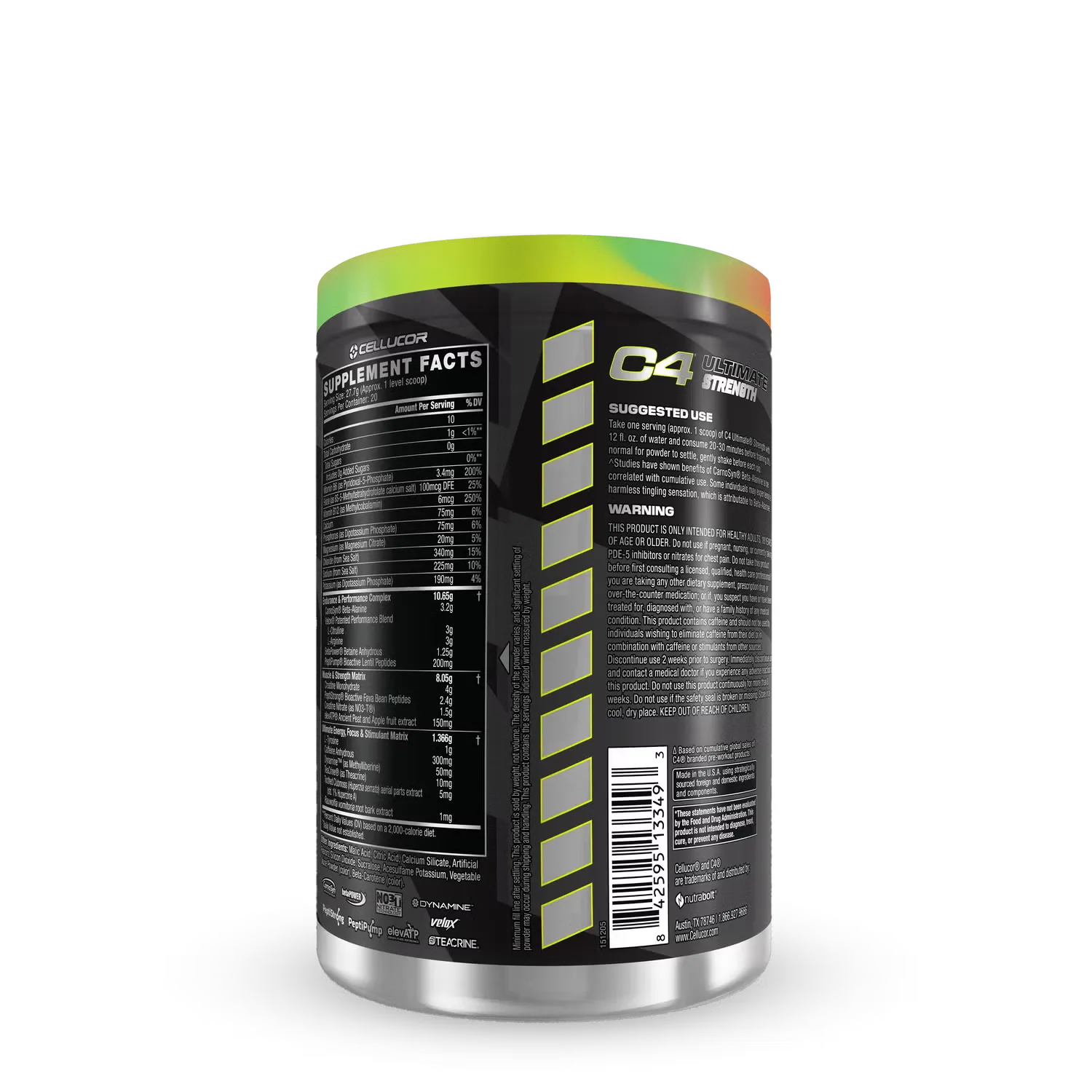 **C4 Ultimate Strength** مکمل پیشتمرین قدرتمندی است که با ترکیباتی مثل **300 میلیگرم کافئین**، **5.5 گرم کراتین**، **3.2 گرم بتا آلانین** و **200 میلیگرم PeptiPump®️** طراحی شده تا انرژی، استقامت، قدرت عضلانی و تمرکز شما را به حداکثر برساند. این محصول برای ورزشکاران حرفهای، بدنسازان و افرادی که تمرینات سنگین و پرفشار انجام میدهند، مناسب است. همچنین پمپ عضلانی انفجاری و بهبود جریان خون با سیترولین و آرژنین از دیگر ویژگیهای آن است. مصرف آن 20-30 دقیقه قبل از تمرین توصیه میشود.