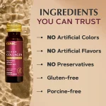 این شات یک مکمل آماده مصرف و خوش‌طعم است که جذب سریع و مؤثر مواد فعال را تضمین می‌کند. فرمول آن فاقد رنگ‌های مصنوعی، طعم‌دهنده‌های مصنوعی، مواد نگهدارنده، گلوتن و ترکیبات خوکی است.