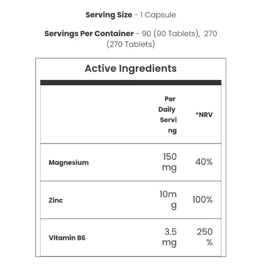 ❽ هر وعده ( ۲ کپسول ) حاوی مواد معدنی و ویتامین های ضروری منیزیم ( ۳۰۰ میلی گرم ) ، روی ( ۲۰ میلی گرم ) ، ۷ میلی گرم ویتامین B6 و فاقد گلوتن